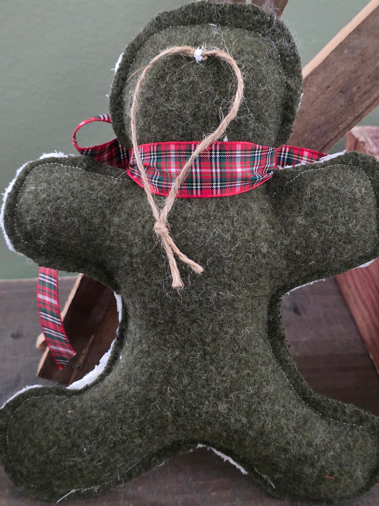 Handmade gingerbread man made from an antique quilt and vintage wool army blanket.