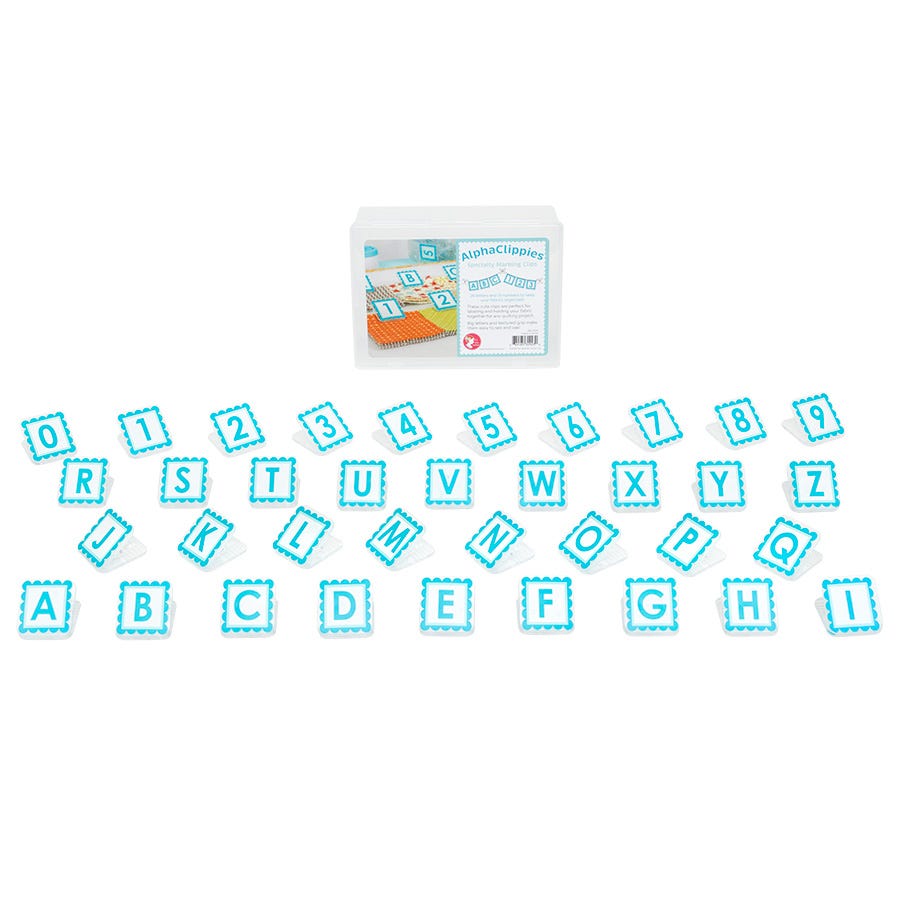 These cute clips are perfect for labeling and holding your fabric together for any quilting project. Big letters and textured grip makes them easy to see and use. 26 letters and 10 numbers to keep your fabrics organized. Stay neat, creative and in control with these cute, colorful, handy helpers! Clips: 1.125" x 1.25" Storage Box: 2.25" x 3.75" x 5.5"